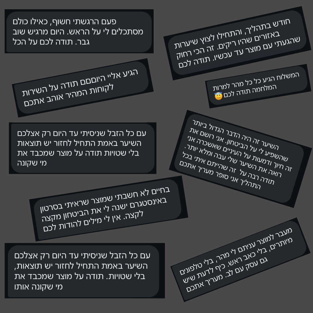 "התחלתי להקריח מגיל צעיר וחבר המליץ לי על מארז הלוחם, אני חודש וחצי בפנים וכבר אפשר לראות תוצאות בעיניים. אפילו הבת זוג שלי אמרה לי "מה זה? השיער חוזר?" ניסיתי הכל, אבל זה הראשון שבאמת נתן שינוי אמיתי." | עידו
